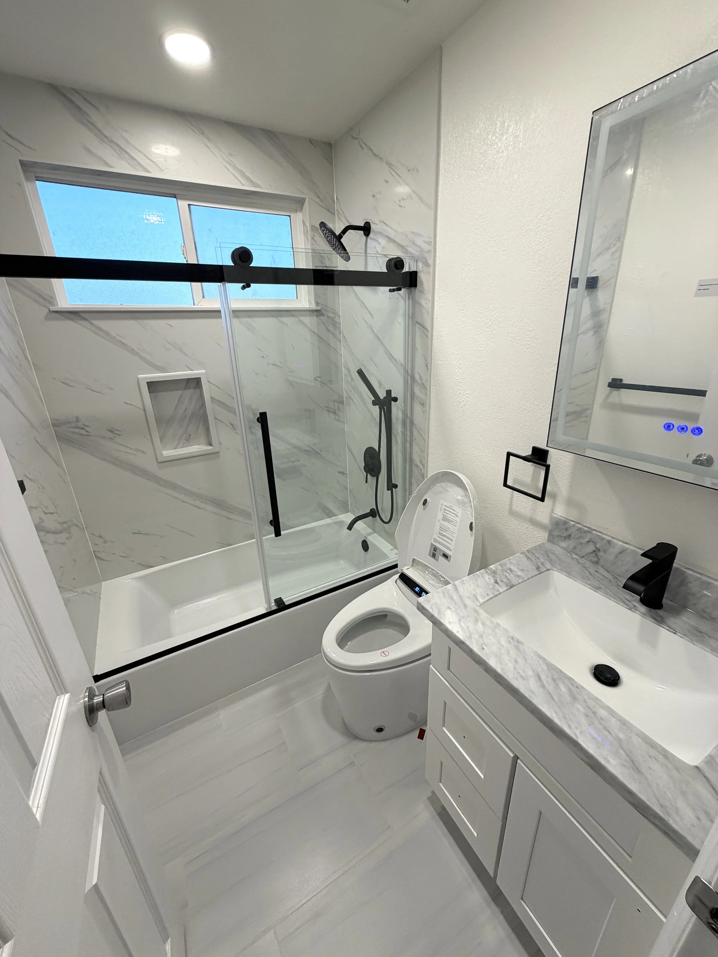 The Hallway Bathroom Renovation at the Mt. St. Helena Residence in San Jose involved a complete transformation of an outdated bathroom into a modern, functional space while maintaining the original plumbing and electrical layout. The project included full demolition and rebuild, featuring installation of a new standard bathtub, upgraded shower system with sliding glass door, and full-height waterproof wall panels with a custom window cutout. Additional upgrades included new porcelain tile flooring, a 24-inch vanity with integrated sink and backsplash, LED recessed lighting, a lighted medicine cabinet, and a new exhaust fan with roof venting. Electrical improvements such as GFCI protection and new wiring were also completed to meet current standards. The finished space delivers a clean, contemporary design with improved lighting, durability, and overall functionality, resulting in a fully refreshed bathroom ready for long-term use.