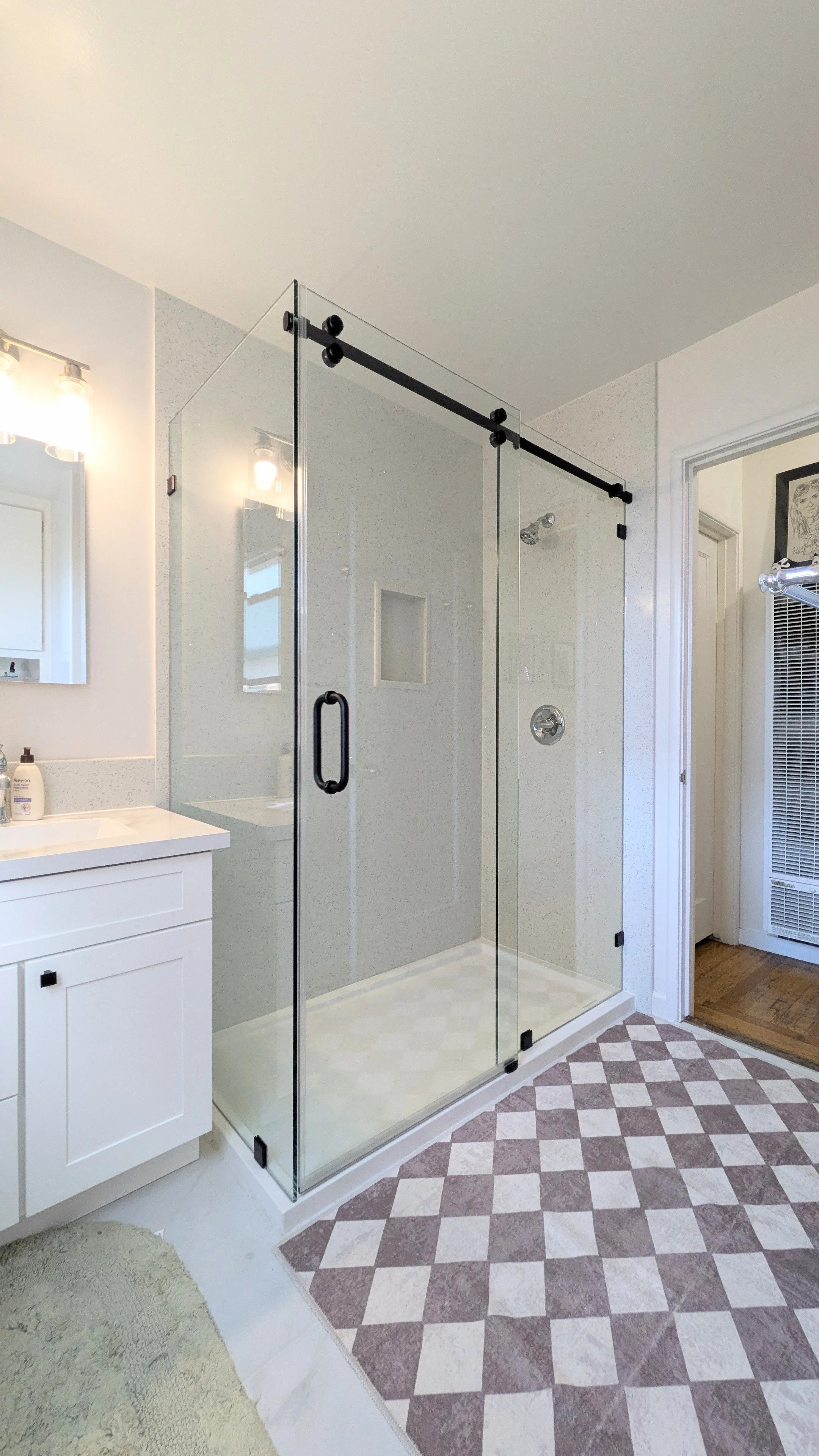 We turned an outdated bath into a clean, modern retreat. The project included a full demolition and rebuild — transforming the old tub into a walk-in shower with a custom base, wall panels, and frameless glass enclosure. We replaced flooring, vanity, and subflooring damaged by leaks, and added new lighting, exhaust ventilation, and fresh finishes throughout.